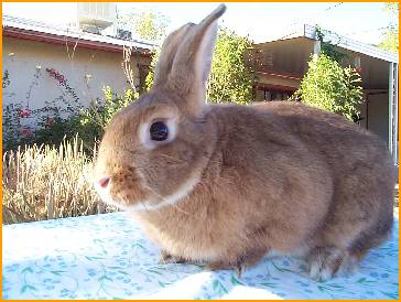 A beautiful little Rex mix with gorgeous eyes, Sophie has absolutely perfect features. As she has gotten older her fur has darkened in color from a medium orange-tan to a darker chestnut brown. She was a little shy when I got her but she has come around spendidly, and enjoys very much her run-time in the house. Her favorite food is carrot greens, and she often stuffs her mouth with them, and looks really funny with a huge bunch of carrot greens hanging out of her mouth while she contentedly munches on them. She loves to be brushed, which I try to do two or three times a week. While not as comical and social as Teddy, or as in-your-face as psycho-bunny Cisco, Sophie is very gentle and lovable, and is a joy to have around.