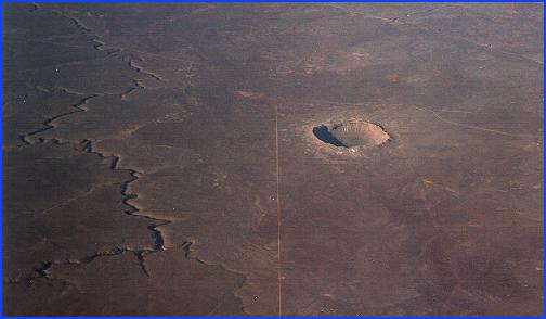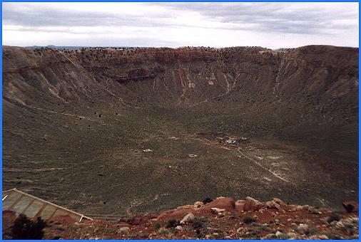 Just east of Flagstaff is a natural wonder not seen in very many places on our planet. Approximately 75,000 years ago, a large nickel-iron meteor plunged into the earth's atmosphere and survived the fiery trip to the ground. In what was undoubtedly an unimaginable, indescribable explosion, the above crater (as seen from the air) was blasted into the serene, flat landscape. Ejecta has been found over three miles from the impact point. The photo below is from the crater rim. |