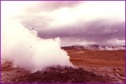 The Lake Myvatn area near the northern city of Akureyri is only a few scant miles short of the Arctic Circle, and is an eerie, surrealistic landscape of volcanic activity. The land is very young in geological terms (only about 5000 years old), and active steam vents are everywhere. |