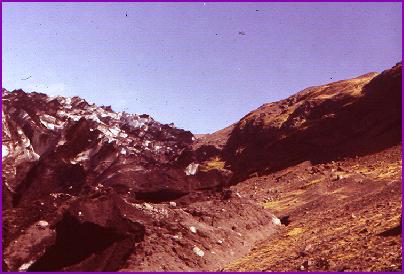 One of my adventures was to climb on top of a glacier. In the picture on the left, the glacier is the black-and-white area on the left side. It is that way because it's covered with a sprinkling of volcanic ash. The ice of the glacier itself is a deep, startling sky blue. You can hear a lot of water rushing around inside it. In fact, the melted water from the glacier produces some pretty amazing waterfalls (right photo). |