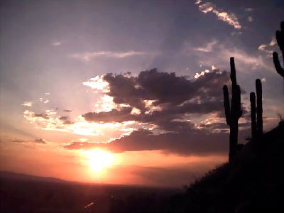 An incendiary sunset ignites the skies above Phoenix, Arizona, my adopted home. In Phoenix we are alternately blessed and burdened by some of the most interesting, unpredictable and changeable weather of any place I have ever called home. We are treated regularly to breathtaking, dramatic sunsets, but also blasted unmercifully by searing, arid summer heat. During the summer monsoon season you can watch the huge thunderhead clouds building in the northeast above the Mogollon Rim, and at sunset the thunderclouds collapse and come screaming down the mountains into the valley, sometimes causing hurricane-like winds and enormous downpours. Since storm drainage is somewhat of an afterthought here and "washes" (natural water channelways) are relied upon for drainage, the roads around here get flooded very easily. |