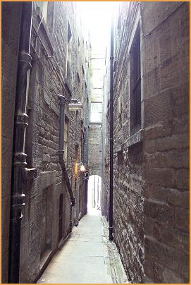 A narrow passageway between buildings is called a "close". This is because in medieval times, there was not a lot of suitable land on which to build, so instead of spreading out the buildings grew vertically. Closes usually led to a common courtyard used by a number of buildings (see below). This particular close is called the "Fleshmarket Close". Don't ask why. | ||