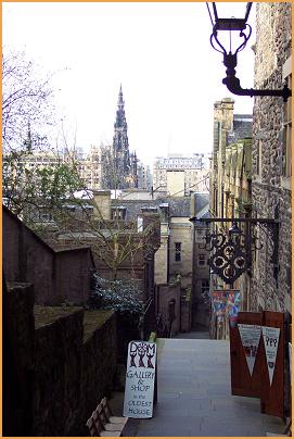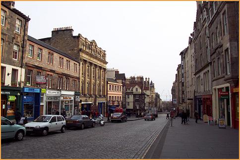 This is a look down the east end of the Royal Mile. The John Knox house is just to the right of center of the photo. It is one of the oldest continuously inhabited buildings in Edinburgh, built in 1556. | ||